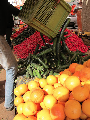 The skype conversation reminded me of how I think about things when I was back home. I’m still interested in the politics/social/global aspects of food so it’s something I do read about from time to time with my lovely internets. I just recently read an article about quinoa and how it’s affecting the native farmers and poverty in Bolivia, my good friend Caitlin is asking questions on how she can make the world the better place, how to be more environmentally conscious and reduce our impact on the earth and the global community. These are the sorts of things I thought about all the freaking time in America. Sometimes I didn’t walk the talk, but I knew when I wasn’t. I hadn’t bought or accepted a bottle of water in almost a full year when I left for Morocco. Now here, I buy bottled water because in some places the water isn’t drinkable or tastes absolutely terrible and I need to have the extra bottles around my house in case my water goes out for a long period of time, I don’t think about it. Now that I’m a year in I am beginning to be aware that I’ve accumulated an obscene amount of perfectly good plastic shopping bags that I get when I buy my veggies each week. Let me clarify, I get a plastic shopping bag after I pick out what vegetables I want from the same dude every week that are arranged nicely in big plastic milk crates that are re-used every week. I put the veggies in the banged up plastic bin, he weighs them, then tosses the in a plastic bag which I then put in my backpack. I’m not thinking about where these vegetables are coming from, whether their gmo or how much gasoline was used to cart them to me. I’m not staring at the shiny plastic rows of supermarket apples tied up with a bag clip. My weekly routines feel more like a farmers market then anything else.